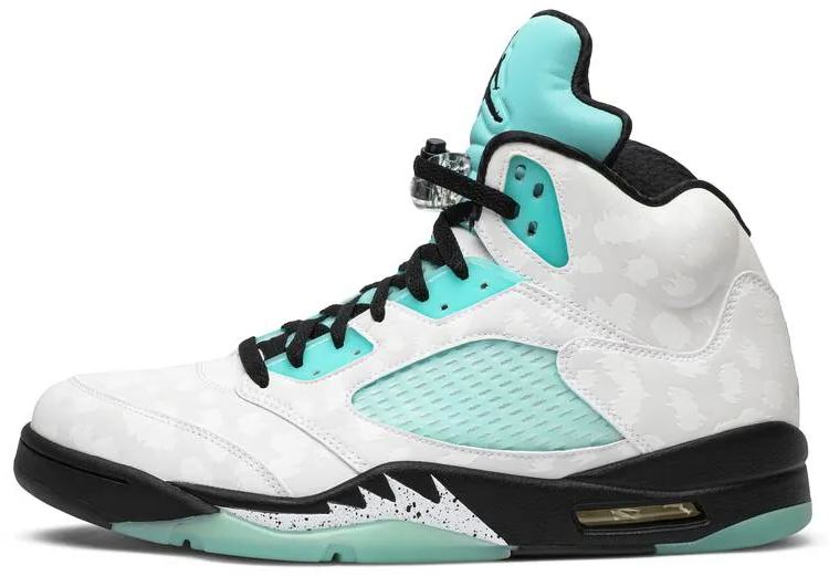 This take on the Air 5 gives Michael 's fifth signature sneaker an updated look and an 'Island Green' color scheme. Released in November 2019 . the shoe boasts a white leather upper decorated with tonal leopard print and Island Green accents on the tongue . eyelets . quarter panel netting and translucent outsole. Classic elements from the original model . first seen in 1990 and inspired by a WWII fighter plane . include shark-tooth shapes on the midsole and a visible Air unit.